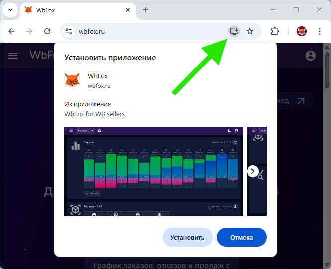 Для установки приложения кликните на значек install_desktop в адресной строке браузера