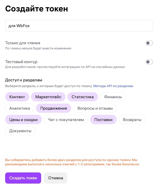 - Указать токен доступа в настройках магазина здесь на WbFox.